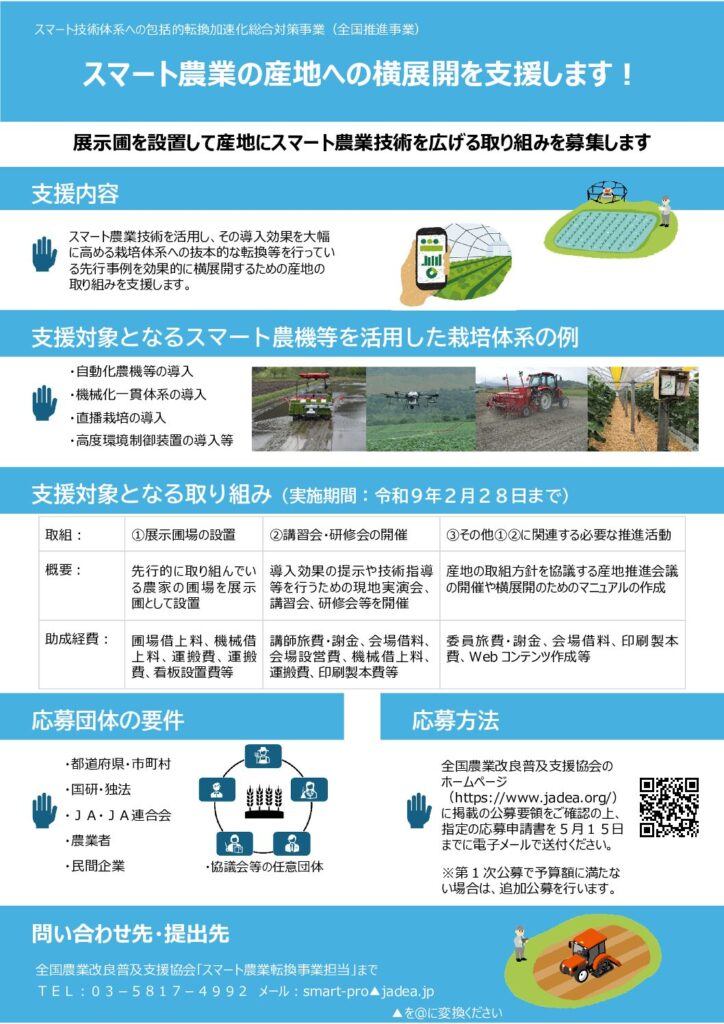 このたび、下記により、スマート技術体系の横展開を図る産地等の公募(第一次公募)を行っておりますので、お知らせいたします。